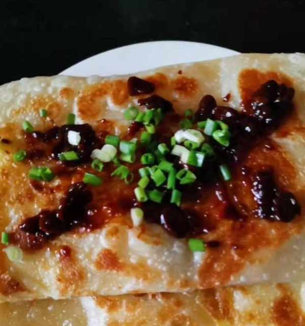 醒好的面胚搟成長方形,下鍋烙,一面變色即翻面,多翻幾次,直到餅鼓泡,灌入打散的雞蛋,再烙至雞蛋凝結,表皮酥黃,刷上醬、蔥,好吃得不得瞭。
