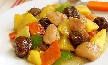 5.取炒鍋,倒入少許油,燒熱後放入雞腿肉塊,變色後撈出,用鍋裡剩下的油爆香洋蔥。放入胡蘿卜和青椒,略炒幾下後放入雞肉,倒入剛剛調好的味汁,連同話梅一起倒入。