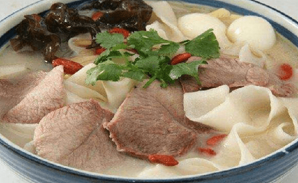 河南燴面算的是中原地區最出名的面食,與北京炸醬面不同的是,它是一種湯面,精華都在鮮香的湯裡,河南廚師一般都選用上等的嫩羊肉和羊骨一起熬湯,先大火煮開,再用小火慢燉,耗時五六個小時才能熬出來帶著奶白色的燴面湯。再煮好寬薄的燴面,加入海帶絲、豆腐絲、肉、粉條等配菜,撒上香菜和蔥花,一碗香噴噴的燴面就端上桌瞭。