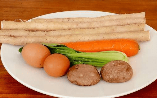 山藥、雞蛋、香菇、青菜、胡蘿卜。