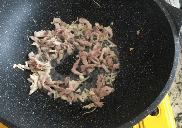 3、 鍋中倒入適量油,先把生薑和大蒜末炒香,再倒入肉絲快速翻炒。