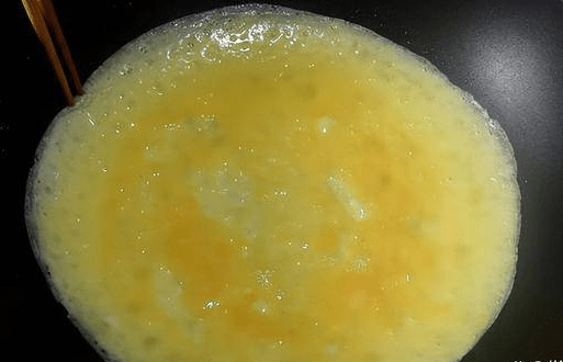 3、 鍋中倒入適量油,把雞蛋液倒入鍋中,旋轉鍋底,把蛋液攤勻,煎成型後盛出來,用刀切成片狀。