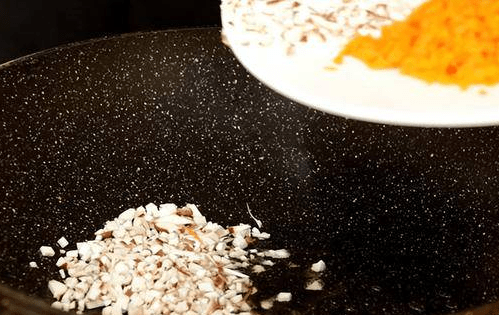4、 鍋中倒油,先把胡蘿卜和香菇末倒進鍋中煸炒幾下。