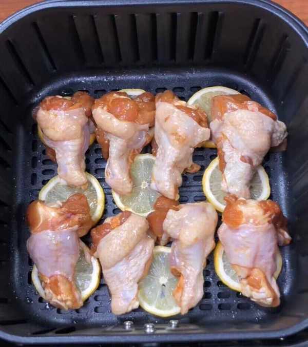 第三步:空氣炸鍋鋪上檸檬片依次擺放雞腿,空氣炸鍋180度烤18分鐘,中途刷醃料(勤翻面,可以多刷幾次)出鍋前 3分鐘再均勻的刷上蜜汁!