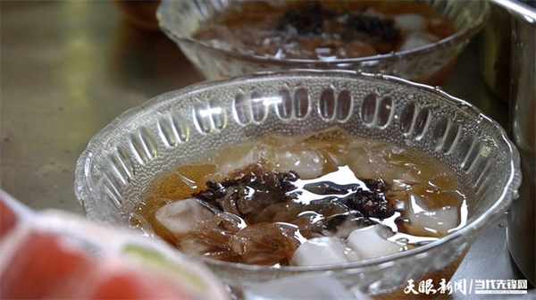 “你還記得我不?我從6歲開始就吃你傢冰粉啦,還是小時候的味道!”28歲的張女士邊和廖再琴攀談邊端起一碗原味野冰粉。勺子在碗裡攪攪,玫瑰糖迅速散開,冰塊與花生、芝麻、黑糯米撞來撞去,一口下去滿嘴清涼,特別受食客歡迎。