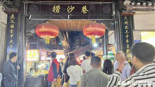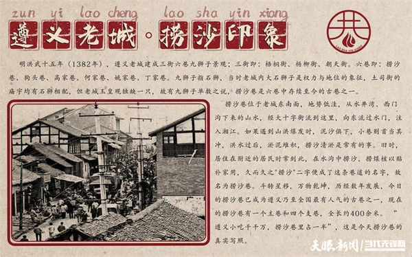 遵義小吃千千萬,撈沙巷裡占一半。由於地處要沖,在遵義老城漸成街市時,撈沙巷就與楊柳街、朝天街、梧桐街以及狗頭巷、丁傢巷等六巷,組成瞭當時遵義老城主要的三街六巷。如今的撈沙巷,除瞭擁有豆花面、籠籠鮓等遵義傳統小吃,還有泡椒雞爪、重慶火鍋等各地美食,深受遊客喜愛。“五一”小長假前三天,這條200米左右長的小巷,每天人流量能達到15000餘人。