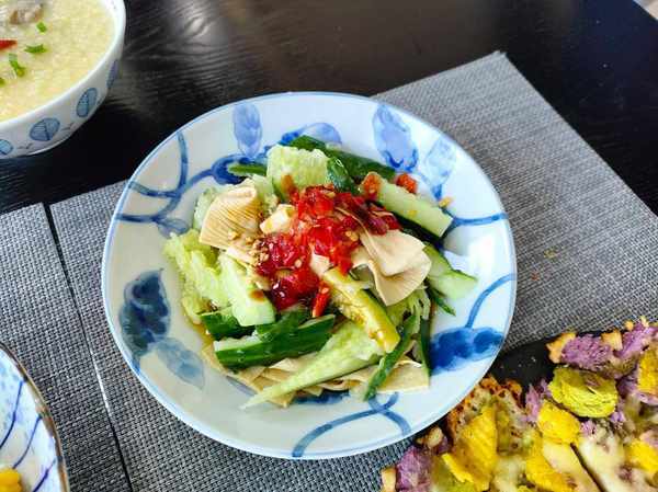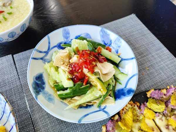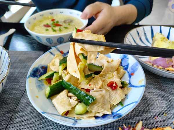最後來個豆腐皮拌黃瓜,哎呀,豆腐皮滑滑的、美美的,搭配黃瓜,還真好吃呀!