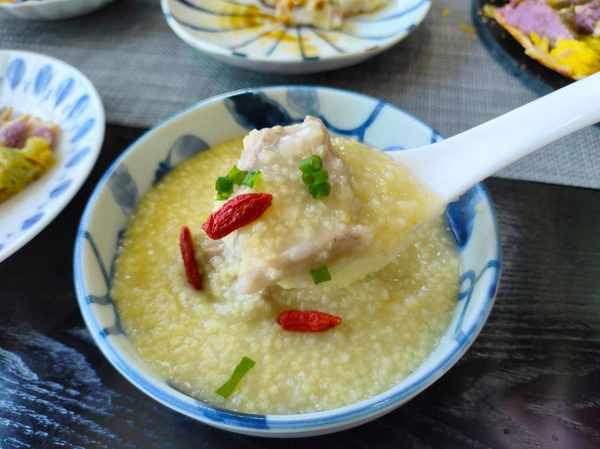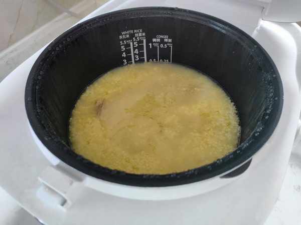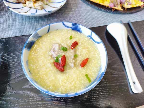 首先,晚上休息前,放入小米和排骨,加入薑片、酒、水,用電飯煲預約煮粥。第二天早上,打開鍋蓋就能吃,還有厚厚的米油哦,加點鹽和蔥花調味!