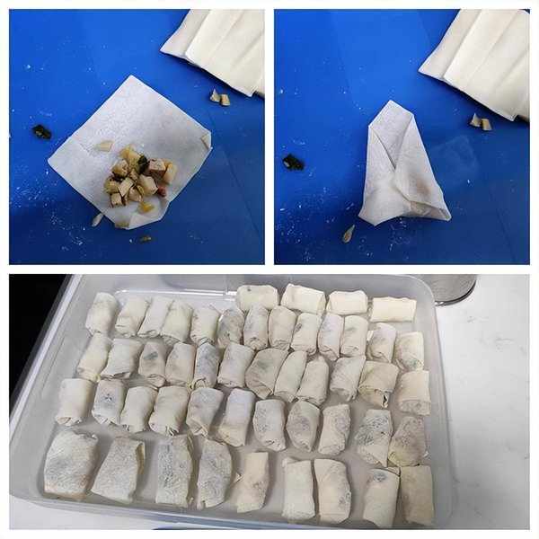 順便看一下,餛飩卷兒的做法,餡料是筍丁炒豆幹,是熟的。