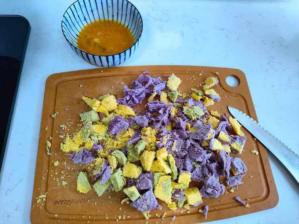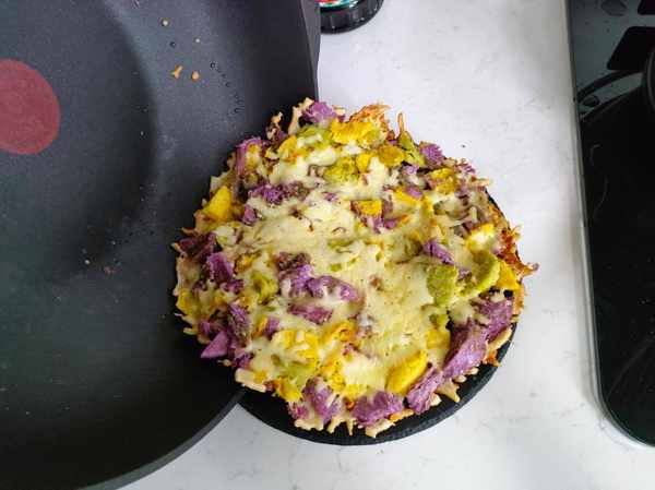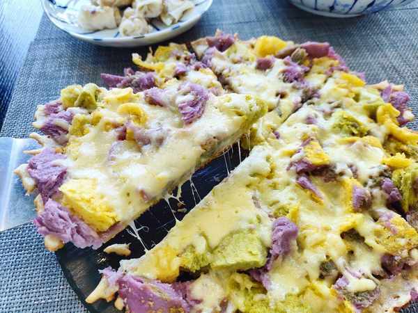 其實是一個饅頭披薩餅,用瞭一個彩色的山東大饅頭,切碎瞭,加點雞蛋液,撒上馬蘇裡拉芝士,會拉絲哦!