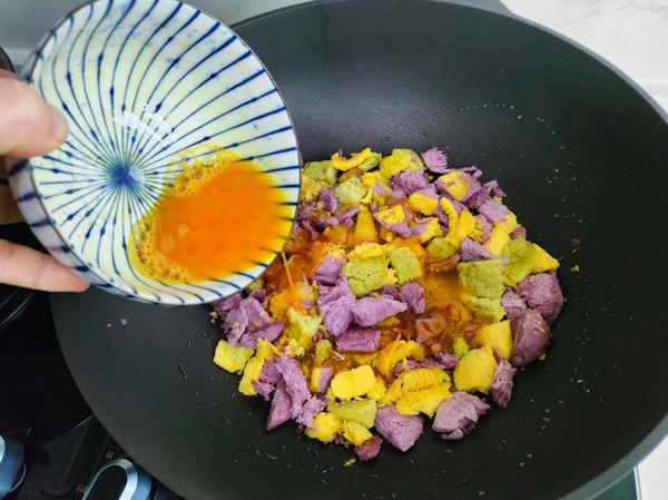 2個雞蛋加少許鹽打散,饅頭切丁。