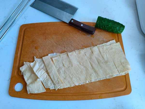 豆腐皮泡軟後,切成條狀。這裡用瞭半張豆腐皮。