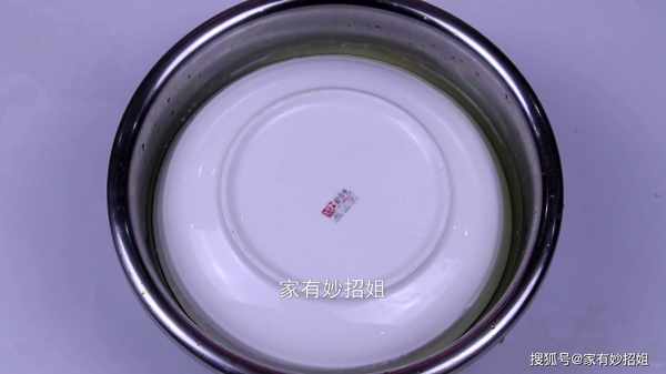 白醋倒好,我們再拿上個盤子,將盤子壓在海帶上,這樣就可以使海帶都浸泡在水中,讓它浸泡上10分鐘。
