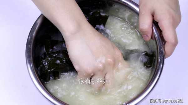海帶浸泡好,我們開始來清洗瞭。大傢都知道,我們買回傢的海帶表面會有一層白色的粉末,有很多人認為它是一層鹽或者是臟東西,甚至還有人認為是發黴瞭,但其實這種物質叫甘露醇,反而海帶表面有這種物質還能證明海帶的品質不錯。不過海帶表面的這些物質比較難清洗幹凈,一些朋友還會用刷子來刷洗,那樣就太麻煩瞭,我們在清洗海帶的時候,可以在裡面加入一大勺的面粉,然後再用手來抓洗海帶。