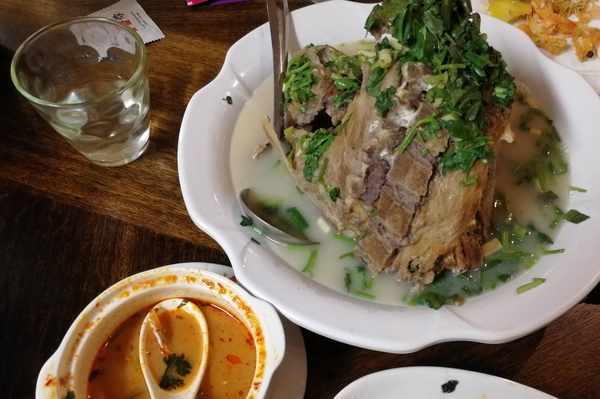 泰國菜的特點是帶點酸辣,這道火山排骨也是一樣。底下的湯汁是酸辣味的,應瞭我們的要求,辣度較少,酸度更多,湯汁就像是冬陰功湯,隻是少瞭香茅等香料的味道,層次感較單一點而已。由於湯汁是酸辣的,所以排骨剛入口時是帶點酸辣味,接著往深層裡的肉探索時,酸味簡單,更多的是肉的鮮甜味。酸辣的湯汁其實還有一個好處!吃這麼多肉容易膩,但是在酸辣湯的搭配下,可以解油膩,讓你不至於很快就止步不前!