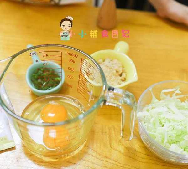 第1步、先準備好材料把菜切碎,蔥增香的,雞蛋我這裡有三個你可以減量做因為開始孩子吃不瞭那麼多。