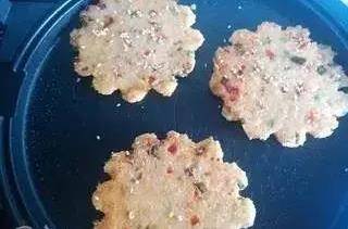 電餅鐺上下盤開關都打開,蓋上上蓋,煎三分鐘左右,翻一面,再米飯餅的表面刷上少許油,撒上芝麻,再煎至金黃即可。