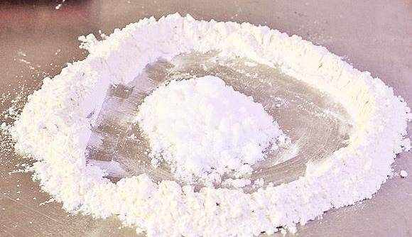 3:往中間倒入綿糖90g,臭粉3g,小蘇打1.5g。