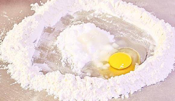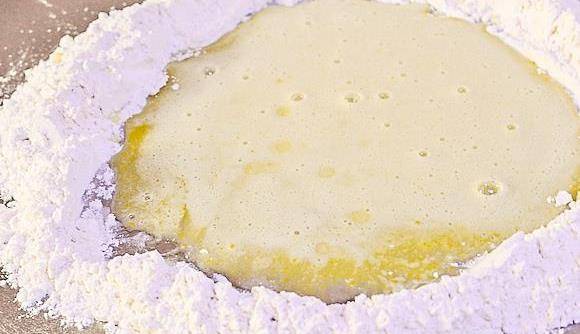 2:找個大些的案板,倒入低筋粉,用刮板在面粉中間打個圓圈出來。