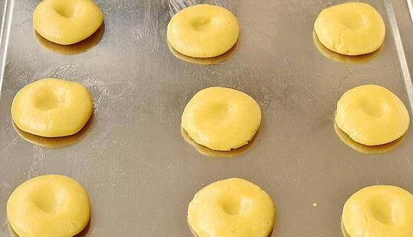 4:烤的時候一定要等溫度達到瞭,再放入烤箱裡烘烤,因為過早放入的話,桃酥會炸不開口的。