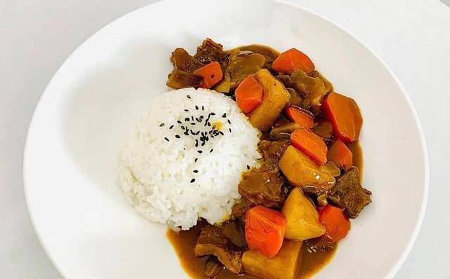 牛肉選擇牛腩比較好吃,不喜歡吃牛肉也可以放豬肉和雞肉。咖喱本來就有咸味,所以不用加鹽瞭。牛肉不容易軟爛,也可以放單獨用電飯煲或者高壓鍋煲煮到軟爛。後面湯汁濃稠就要不停地攪拌,以免糊鍋。湯汁不要收幹,飯泡在湯汁裡才好吃。