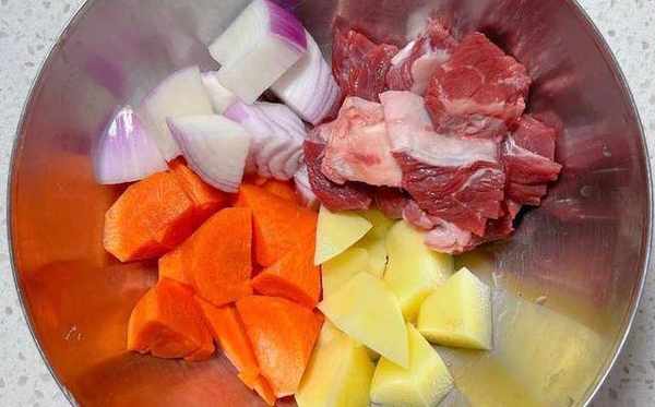 1、牛肉、胡蘿卜、土豆、洋蔥切塊備用;