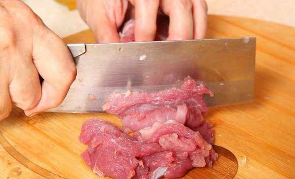 辣椒切片、裡脊肉切片,並將洋蔥去皮,再采滾刀方式切小塊備用。