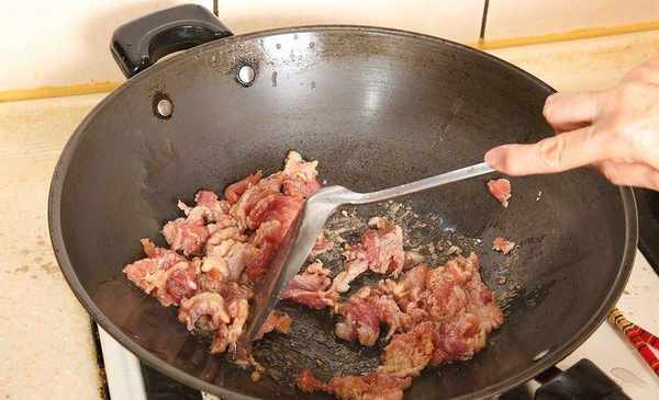 熱油鍋,抓勻的肉片先放入鍋中快炒,肉片變白時先起鍋備用。
