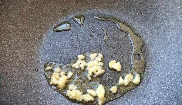 5、蒜切成末。炒鍋倒油燒熱,先炒香蒜末。