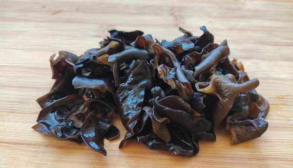 2、涼水泡發黑木耳雖說時間長些,但口感脆嫩,泡發率也比熱水高。處理好後,放到面板上切去根蒂較硬的部分,切成小塊。