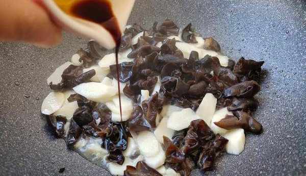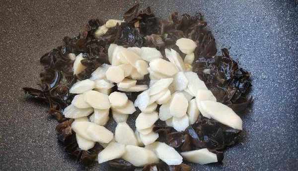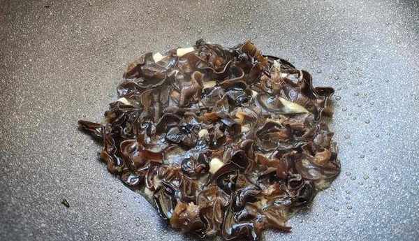 6、接著倒入黑木耳。黑木耳入鍋後,會發出噼裡啪啦的聲音,還會有東西往鍋外濺,不用害怕,往鍋裡倒少許清水就能解決。