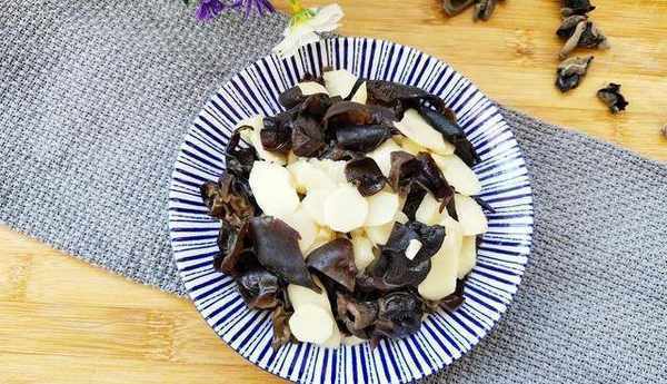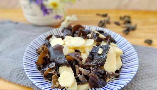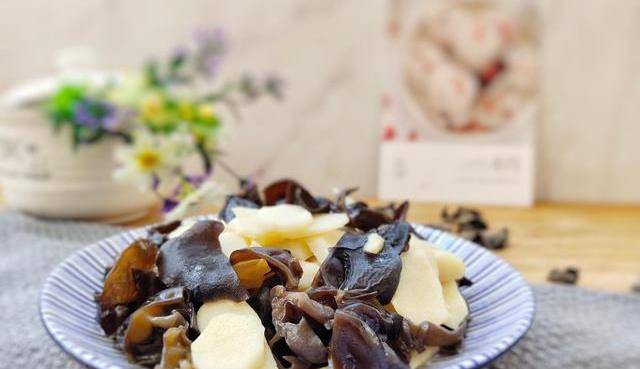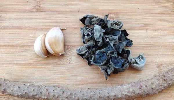 【準備食材】黑木耳1把,山藥1根,蒜2瓣,植物油、食鹽、生抽、雞精適量。