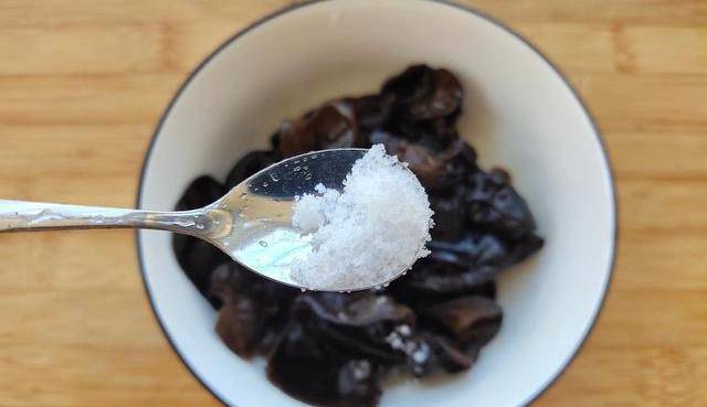 【制作方法】1、黑木耳提前用涼水泡發,大約要半個小時。泡發後瀝去水分,加一小勺食鹽,用手輕輕揉搓,洗掉表面的雜質,沖洗幹凈。