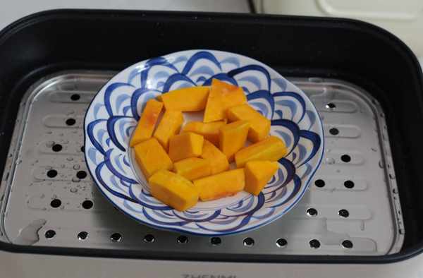 【制作過程】第一步:將南瓜切成小塊,臻米電火鍋加水煮開,放入南瓜,蓋上蓋子將其蒸熟。