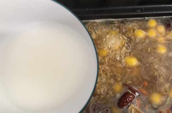 第八步:淀粉加入適量清水調開,淋入鍋中拌勻即可。加入水淀粉,煮好的糖水比較濃稠,更加好喝。