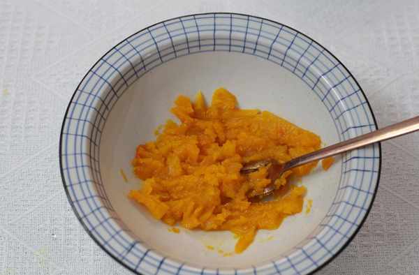 第二步:將南瓜倒入大碗中,趁熱壓成泥。