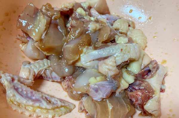 第一步:雞肉洗幹凈後切成小塊,加入適量的鹽,適量的花生油,適量的生抽,1勺料酒一起攪拌均勻醃制10分鐘左右。