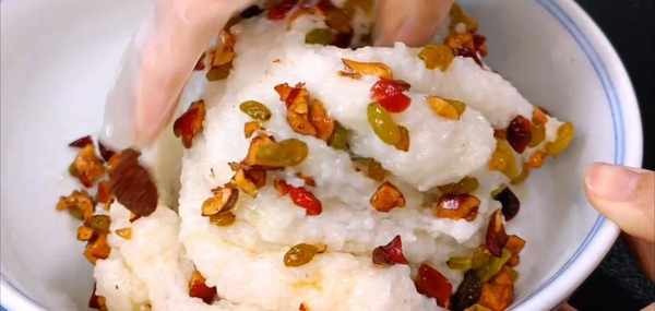 準備食材:糯米、紅棗、葡萄幹,蔓越莓幹
