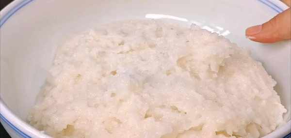 第二步:糯米放進電飯鍋中蒸熟,趁熱挖出來,放進絞肉機中,將它絞成糯米糊,大概每次絞10秒就行,變成比較粘稠的狀態即可,拿出來放在碗裡晾涼。