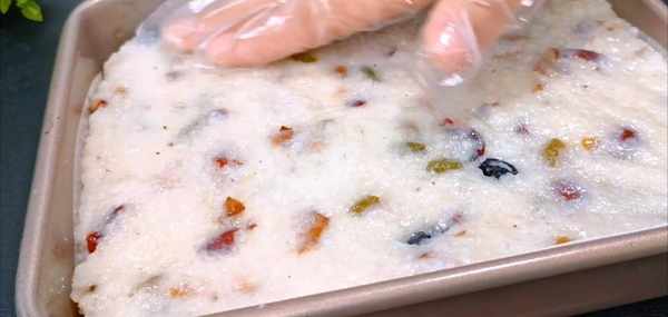 第七步:揉好之後拿出來,放在方形的容器中,記得先在底下鋪一層蛋糕紙,用手使勁壓實壓扁,再蓋上一層保鮮膜,放進冰箱中,冷凍3-4個小時。
