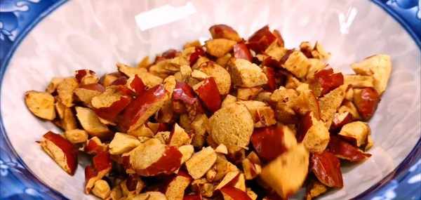 第三步:準備5-7個紅棗,撒入適量的面粉,倒進清水洗幹凈,多洗上兩次,再用刀切成片,取出果核,繼續用刀切成小丁,放在小碗中備用。