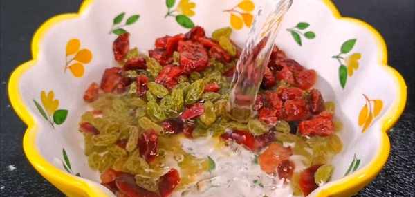 第四步:葡萄幹和蔓越莓幹,放在小碗中,加入一勺面粉,倒入少許清水,徒手抓拌均勻,吸附掉灰塵和雜質,再用清水洗幹凈,多洗上兩次。