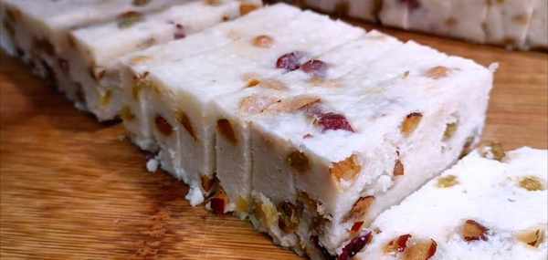 第八步:時間到後,拿出來進行脫模,糯米糕變得軟硬適中,直接用刀切成長條,再改刀切成小塊,瞧瞧這顏色是不是很漂亮呢,不過這時候還沒完成。