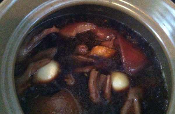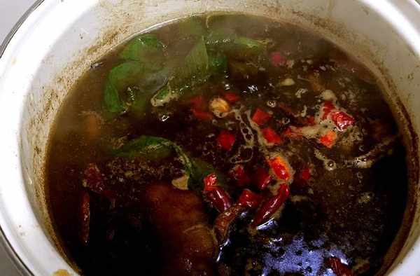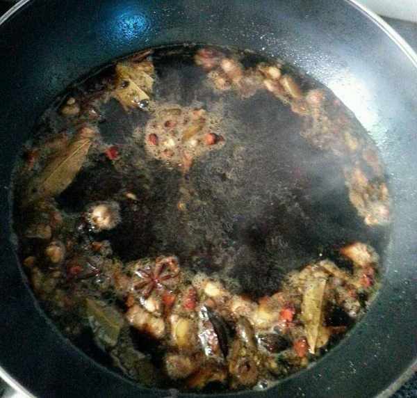 (9)取適量鮮湯,放入蔥薑、調入精鹽、少許味精和糖色,放入香料包,加入紹酒,燒沸後轉小火慢慢熬半小時,至香味四溢時,即成新鮮鹵水。