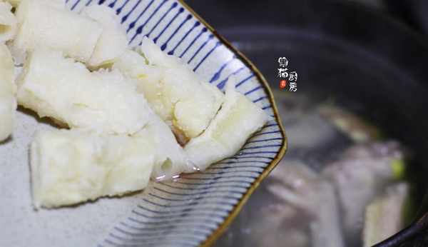 5.泡發好的花膠切成塊,加入煲好的雞湯裡。