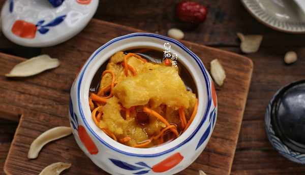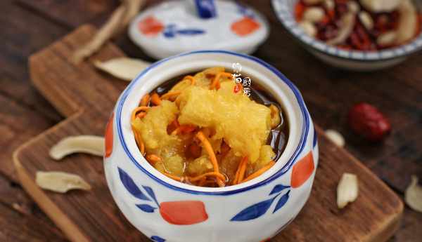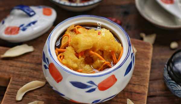 6.最後再把蟲草花加入湯裡,蓋上蓋子小火慢煲20分鐘,讓蟲草花的營養全部釋放出來,花膠也不用熬煮得太長時間,否則容易煮化瞭。