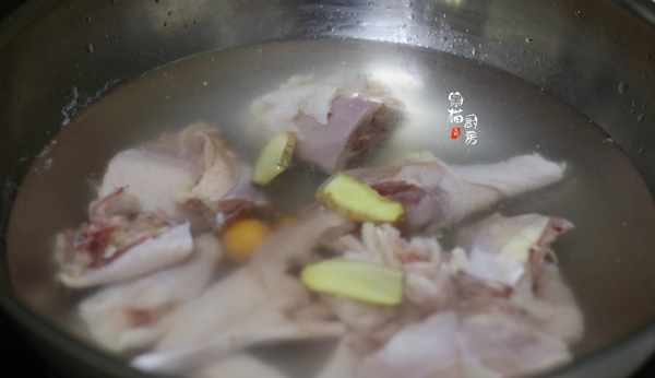 3.把老母雞剁成大塊後,放入冷水中加入薑片,熱水煮沸汆燙後撈出。