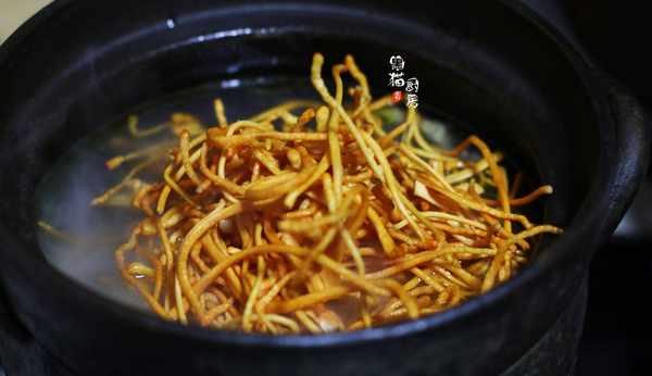 2.準備新鮮的蟲草花,蟲草花其實是一種培植菌類,有十幾種接近人體所需的氨基酸和蛋白質營養,色體金黃,豐富的氨基酸容易被人體吸收消化,從而提高免疫力。幹蟲草花也很常見,煲湯前提前沖洗泡發即可。