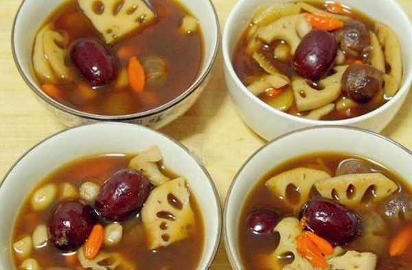 砂鍋裡加入1000毫升的清水,把剛才準備的所有食材全部下鍋(做這種湯盡量使用砂鍋,它的密封性比較好,做出來更加好喝)蓋上蓋子,大火燒開後,改中火煲10分鐘,時間到瞭打開蓋子,放入2塊老紅糖,攪拌均勻,然後蓋上蓋子繼續煲10分鐘,時間到蓮藕的顏色已經變得微黃,湯汁也變得非常濃鬱,這樣就可以瞭,出鍋即可,我們的蓮藕養生湯就做好瞭。這種湯不僅非常的好喝,也是非常的滋補,濃濃的蓮藕清香,蓮藕和花生的口感也很綿軟。