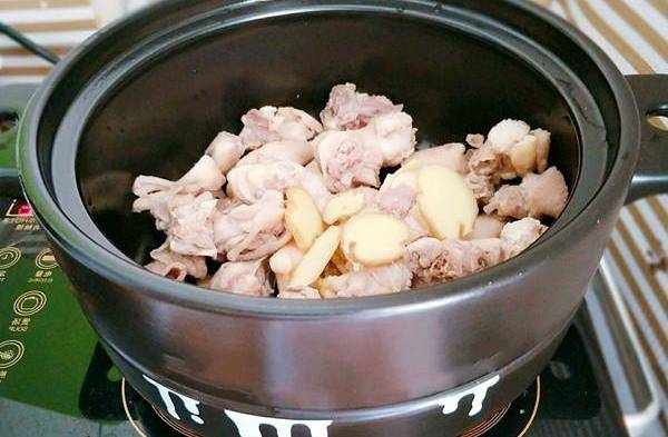 把切好的豬肚和雞肉同時放入鍋中,最好是用砂鍋,要是傢裡沒有用別的鍋也是可以的,放入適量的清水,蔥段,薑片,用大火煮開後,轉入小火熬煮二個小時,在這其間煮出來的浮沫要撇出去,不然會影響口感。